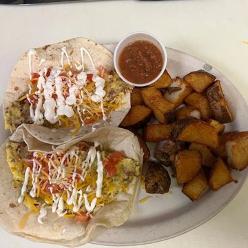 2 Flour Tortillas filled with scrambled eggs, bacon, sausage, tomatoes, onions and cheese with a side of potatoes.